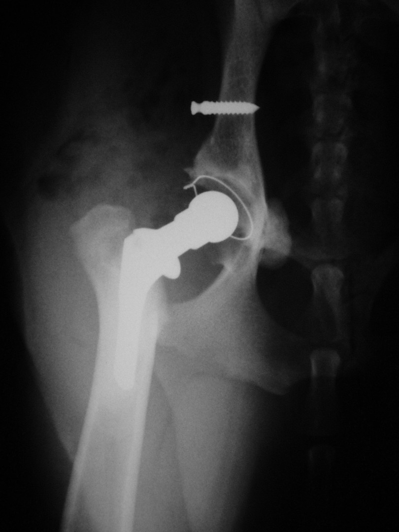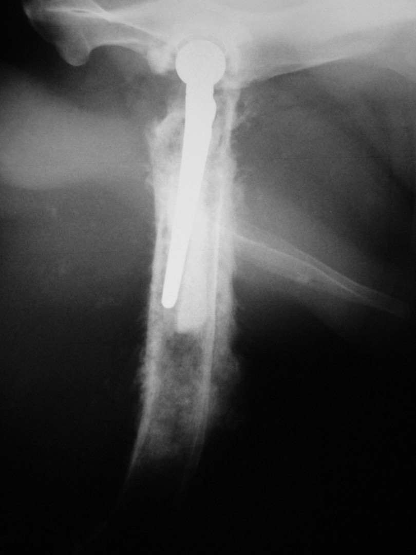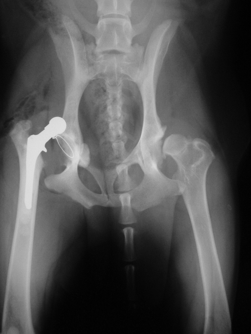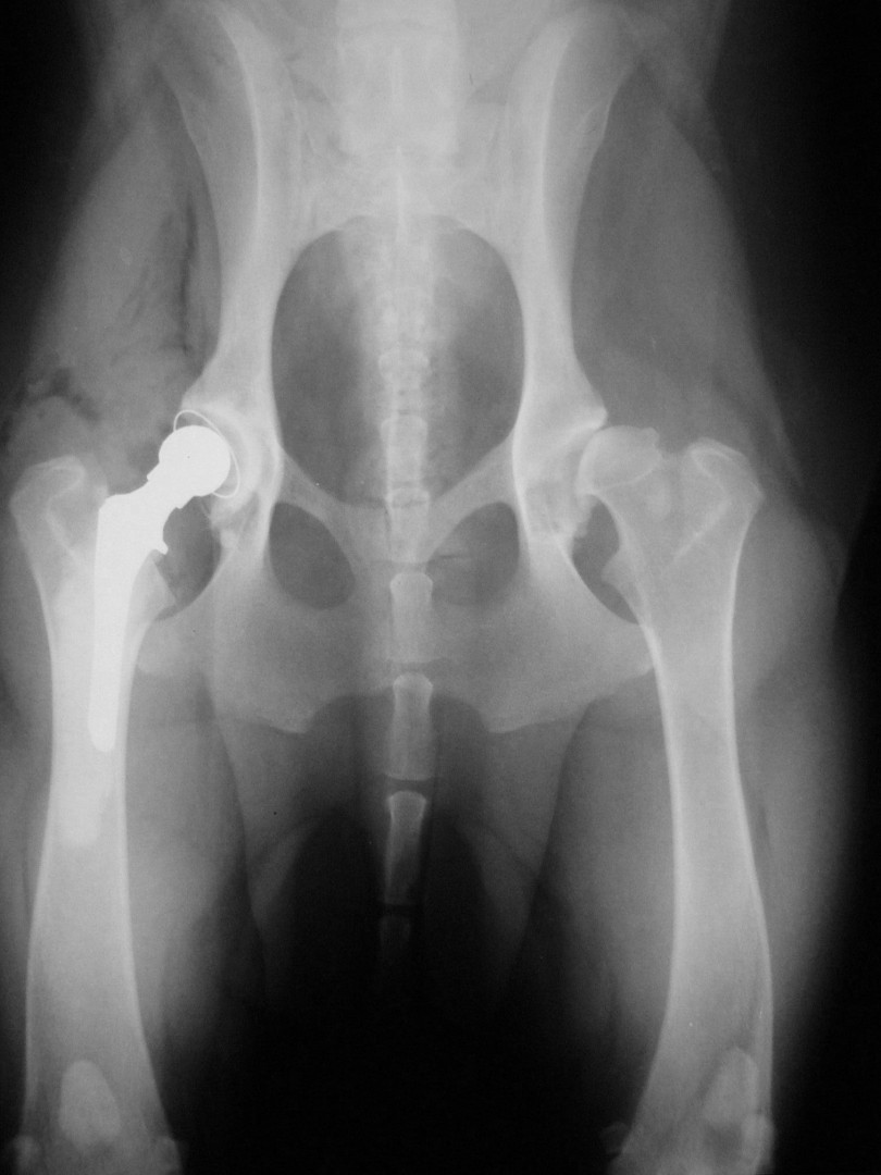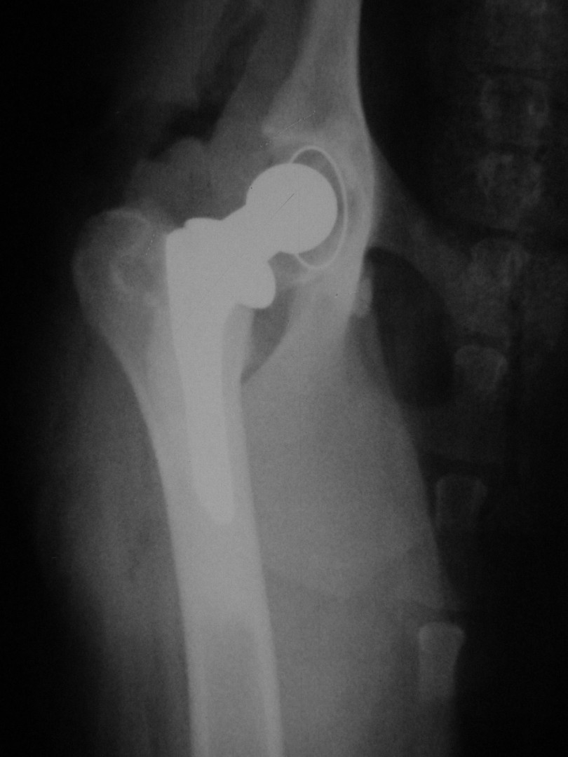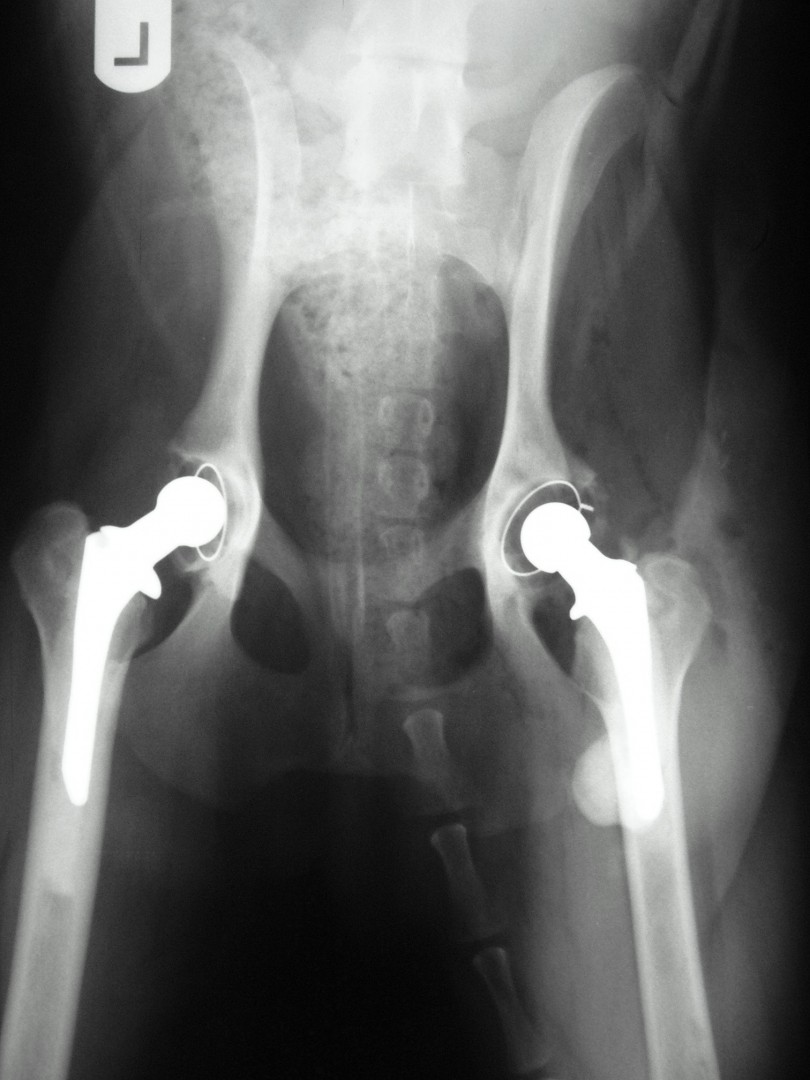 Az első műtét remekül sikerült és Connor, a skót juhász kutya megkapta a bal oldali új csípőízületét. A 7 napi kórházi tartás is problémamentesen zajlott és a varratszedés idejére a műtött végtag terhelése gyakorlatilag hibátlan volt. Az 1 hónapos és a 3 hónapos kontroll RTG vizsgálatokon sem jelentkezett szövődményre utaló jel, az 1 éves postoperatív időszakban már csak az látszott, hogy a műtött lábát jobban terheli, mint a nem operált végtagot. Így 2011. júniusában – immár sokadik csípőízületi protézis műtétként- a jobb oldali csípőízületét is megoperáltuk. Connor gyakorlatilag azóta teljes életet él és vidáman játszik társaival, még birkákat is terel…A majd két éves, a protetizálás során szerzett tapasztalatok azonban nálunk is hozzák a szakirodalomban leírt szövődményi lehetőségeket és arányokat. Leggyakrabban a beültetett protézis ficamával találkoztunk, de akadt sajnos kilökődési reakció is. Ezen problémák – az előzetes tájékoztatás ellenére is- mindig váratlanul érik a tulajdonost és az állatorvost egyaránt. Megoldásuk szinte kizárólag műtéti, ami újabb kockázatot, újabb fizikai és anyagi áldozatot jelent.